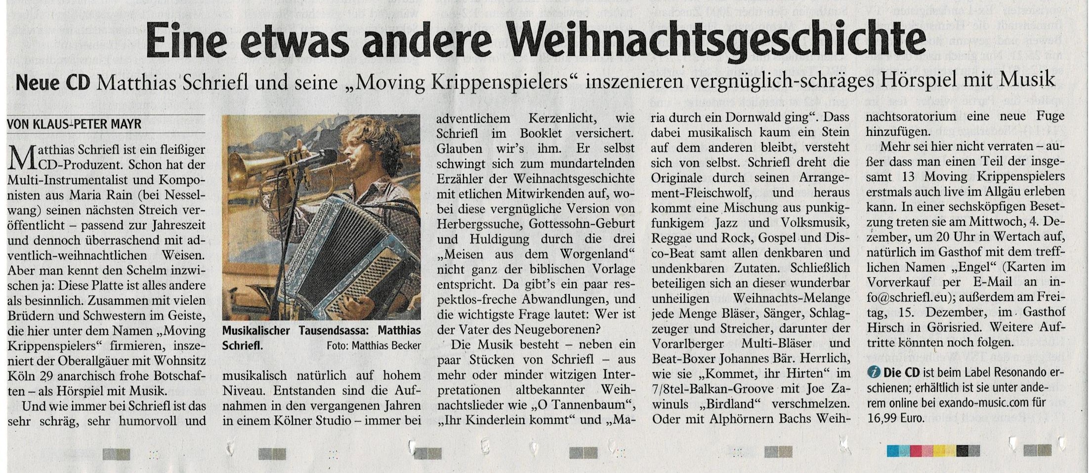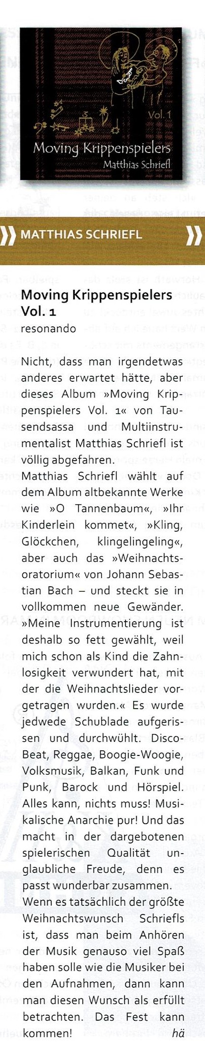 "Matthias Schriefl kenne ich nun schon seit vielen Jahren und verfolge sehr aufmerksam seinen musikalischen Werdegang, meist abseits des Mainstreams, immer auf der Suche nach neuen Einflüssen, die oft angestammte Hörgewohnheiten reizen können. Mit seiner neuesten CD, dem Projekt „Moving Krippenspielers“, hat Matthias Schriefl nun sich selbst übertroffen. Von seinem Label wird diese CD mit dem Worten „Ein Krippenspiel der etwas anderen Art: mit viel Schalk und anarchischer Lust“ angekündigt. Diese Beschreibung ist kein hochtrabender Werbetext, sondern trifft den Kern dieser Produktion haarscharf und punktgenau. Es ist in der Tat ein anarchisches Gesamtkunstwerk, dessen Ulk oder Schalk auch einem Helge Schneider sehr gut stehen würde. Doch abgesehen von den Textbeiträgen bieten vor allem die musikalischen Teile ein besonderes Vergnügen. Traditionelle Lieder, die zur Weihnachtszeit zum allgemeinen Musikkanon zählen, kommen plötzlich in einem ungewohnt fremden Gewand daher, jazzig, vor allem sehr oft stramm groovend und zum Mitwippen animierend. Beachtlich ist vor allem die große Palette der Stilrichtungen, mit denen das bekannte Weihnachtsliedgut neu gestaltet worden ist. Für mich ein besonderer Hörgenuss." Gerhard Richter