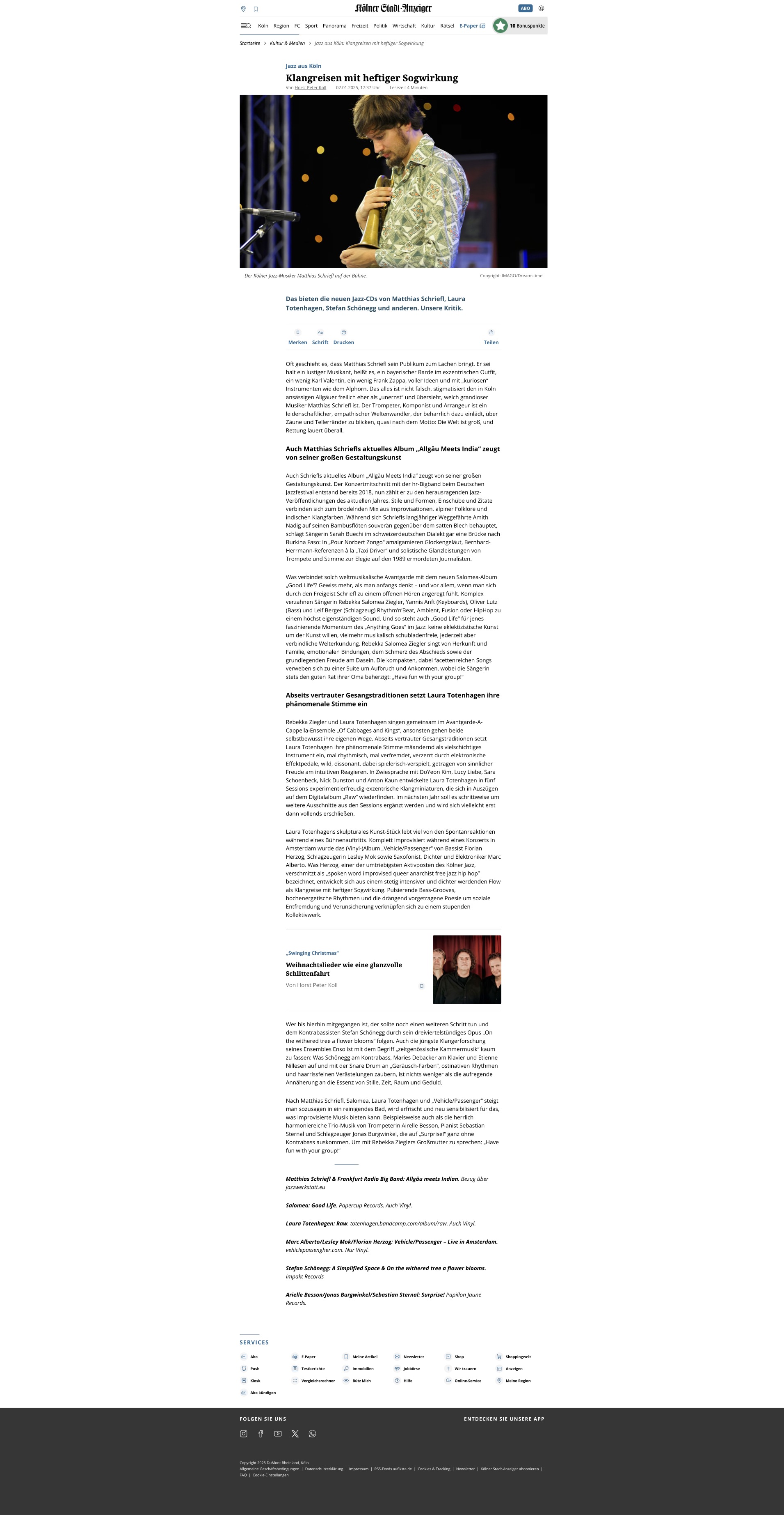 "Oft geschieht es, dass Matthias Schriefl sein Publikum zum Lachen bringt. Er sei halt ein lustiger Musikant, heißt es, ein bayerischer Barde im exzentrischen Outfit, ein wenig Karl Valentin, ein wenig Frank Zappa, voller Ideen und mit "kuriosen" Instrumenten wie dem Alphorn. Das alles ist nicht falsch, stigmatisiert den in Köln ansässigen Allgäuer eher als "unernst" und übersieht, welch grandioser Musiker Matthias Schriefl ist. Der Trompeter, Komponist und Arrangeur ist ein leidenschaftlicher Weltenwandler, der beharrlich dazu einlädt, über Zäune und Tellerränder zu blicken, quasi nach dem Motto: Die Welt ist groß, und Rettung lauert überall. (...) Horst Peter Koll, Kölner Stadtanzeiger, Januar 2025 jazz-aus-koeln_-klangreisen-mit-heftiger-sogwirkung-_-koelner-stadt-anzeiger.pdf